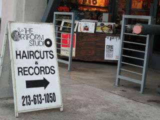 Located on the corner of East 3rd Street and 4th Place, the unique shop invites visitors to take a look inside, using a sign advertising "Haircuts & Records" while James Brown’s “Super Bad” plays from a sidewalk stereo.