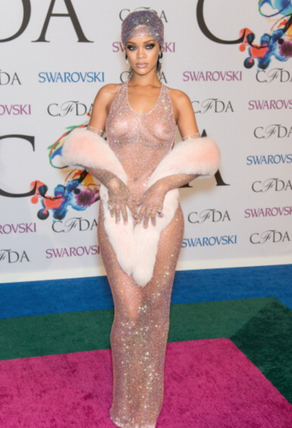 Rihanna While this might not have been Rihanna’s best red carpet moment of the year, it was certainly the most memorable. The “Diamonds” songstress loves to make headlines with her unpredictable behavior, but no one could have guessed she would arrive at the CFDA Fashion Awards in May with her nipples exposed. She accessorized the completely sheer Adam Selman fishnet gown with gloves and a headscarf embellished with Swarovski crystals. |