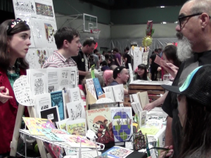 Donna Letterese explains the "punny" nature of her zines to a father and daughter. (Emily Mae Czachor/Neon Tommy)